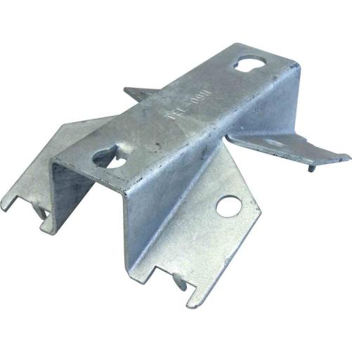 Une semelle CPB suffit pour la fixation d'une traverse appui commun sur poteau bois. La fixation de la traverse se fait par deux boulons d'assemblage 1/12. La semelle se cercle sur le poteau à l'aide de deux feuillards 20 x 0,7mm.