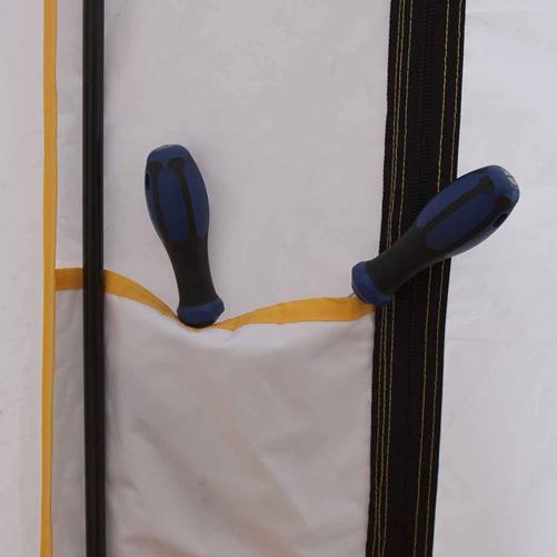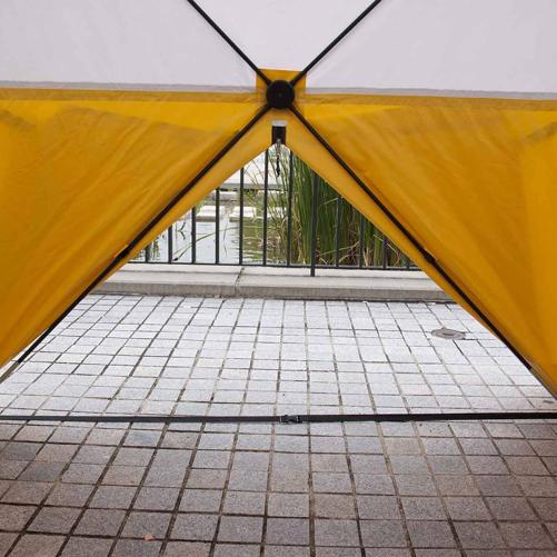 La robustesse et la stabilité conférées par ses arceaux en fibre de verre et ses pieds goupilles en font une tente de travail extérieur facile à installer et à transporter. La tente de chantier pliable reste compacte une fois pliée dans son sac de transport et prend donc peu de place dans un véhicule. La toile peut être lavée au jet d’eau ou au nettoyeur haute pression, facilitant grandement son entretien.