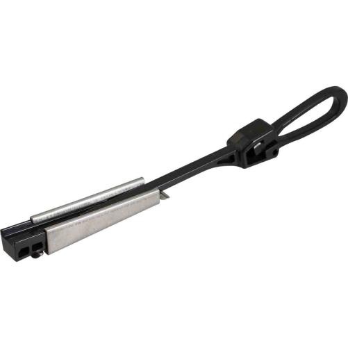 Arrêt sur poteau ou façade des câbles de branchement optiques plats. Ce dispositif se compose d'un corps en tôle inox, d'une cale intercalaire en inox et d'un coin plastique dont l'extrémité a la forme d'une anse ouvrante et verrouillable.