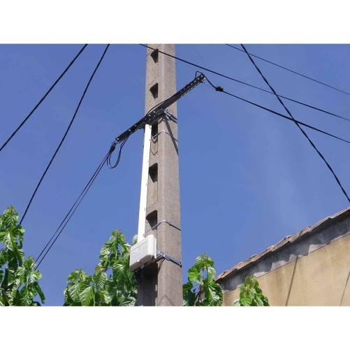 Cette bride permet la fixation de points de branchement PBO ou de boites BMX ou PC sur appui commun ENEDIS BT. Elle se fixe sur l'appui ENEDIS BT par l'intermédiaire d'un feuillard 20mm et d'une boucle feuillard, à l'aplomb de la traverse appui commun, de manière à laisser 3 faces de l'appui disponibles pour ENEDIS.