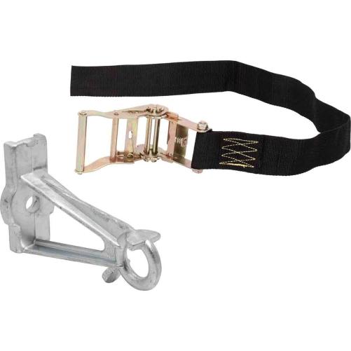 Composé d’une console de suspension en aluminium et d’une sangle à cliquet, ce dispositif pratique et rapide de mise en œuvre permet d’accrocher temporairement les poulies sur les poteaux.