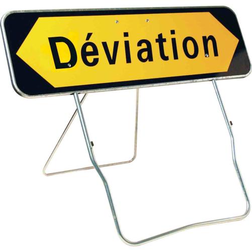 Ce panneau de signalisation temporaire indique une déviation due aux travaux. Monobloc à double bord avec talon d'occultation pour une indiquer la direction à prendre. Le pied arrière se bloque sur position ouverte ou fermée.
