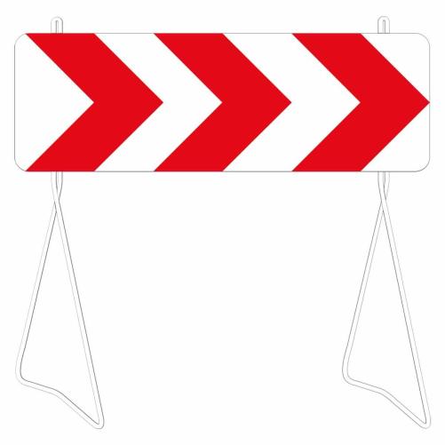 Panneau indiquant une déviation, un rétrécissement sur la voie ou un virage sérré. En acier galvanisé, léger et rigide, le panneau est non agressif pour une pose en toute sécurité sur support mobile.