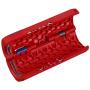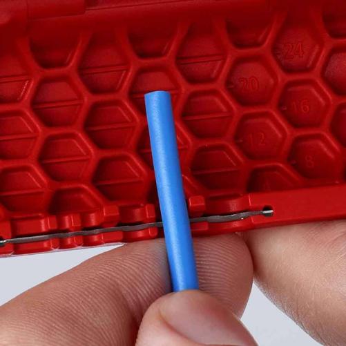 La coupe se fait sur la tranche extérieure grâce à deux lames de guidage, et n'entraine aucun écrasement de la gaine. La coupe se fait en toute sécurité grâce à des lames profondes prévenant tout risque de blessure accidentelle. Son corps en plastique et ses dénudeurs intégrés pour câble de Ø0,2 à 0,4mm font de lui un outil léger et compact.