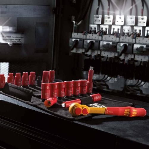 Coffret de douilles isolées 1000V fournies avec un cliquet bi-matière isolé réversible pour douille 3/8". Le pack est compris dans un étui textile pour un transport et une utilisation rapide et ordonnée.