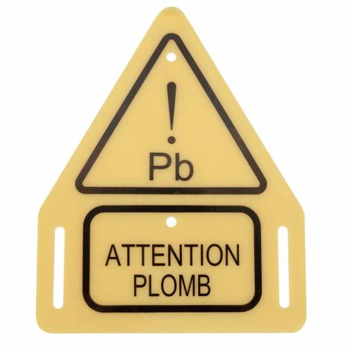 Étiquette jaune triangulaire en PVC tampographiée de la mention "Attention Plomb". Cette étiquette a été développée selon le cahier des charges de la Direction de l'Intervention en charge de la Prévention et de la Sécurité chez ORANGE. Elle est destinée à équiper les ouvrages souterrains ORANGE (chambre, galeries) dans lesquels se trouvent ou ont été déposés des câbles plomb, afin de prévenir les intervenants du risque.