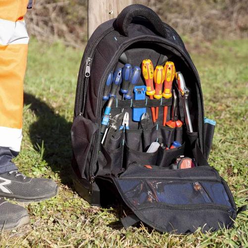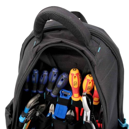 Ce sac à dos est idéal pour les techniciens transportant des outils légers ou peu de matériels. Il a été pensé pour offrir un moyen de transport confortable et un rangement astucieux de l'outillage professionnel. Pour cela, il dispose de deux grandes poches intérieures comprenant une dizaine d'emplacements. Ils permettent un rangement ordonné de l'outillage à main. Le rabat à l'avant élargit l'ouverture du sac pour accéder plus facilement à son contenu. Le sac contient également une poche intérieure étanche et une poche extérieure pour le rangement de sachet de vis, chevilles, petits carnets ou tout autre matériel de petite taille. Des poches latérales permettent un stockage supplémentaire. Le sac à dos est doté de bretelles et d'un dos matelassés pour plus de confort lors du transport.