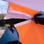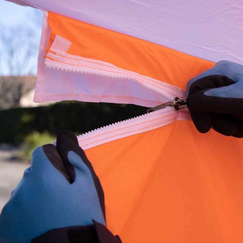 La partie haute de la tente parasol blanche couplée à la fenêtre présente sur la toile permettent le passage de la lumière naturelle dans la tente de travail exterieur pour offrir un rendu fidèle des couleurs, des brins de fibre par exemple. Orange et disposant d'une bande réfléchissante, le parapluie-tente TED® assure une très bonne visibilité de l'abri afin d'être repéré facilement des automobilistes, aussi bien de jour que de nuit.