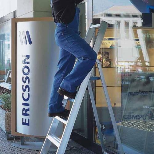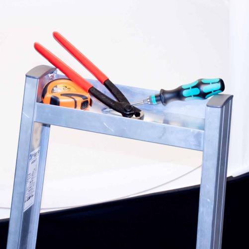 Escabeau FRIGERIO pour usage intensif et déplacement fréquent de l'outil. Le repose-pieds ainsi que les marches ont été testés à 150kg. Un porte-outils est intégré au sommet de l'escabeau pour permettre de déposer le petit outillage. Disponible dans des hauteurs allant de 0.70m à 1.62m, de 3 à 7 marches