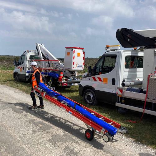 L'échelle sans appui d'AUDINNOV représente une solution légale, efficace et sécurisée pour permettre aux techniciens télécoms d'intervenir en hauteur sur les poteaux dans le respect des normes.