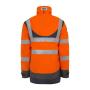 Parka d'hiver haute visibilité orange de classe 3. Elle permet d'assurer la visibilité des techniciens grâce à sa couleur fluorescente et ses bandes rétroréfléchissantes. Ses manches préformées offrent plus de confort dans les déplacements. La partie imperméable peut être retirée pour conserver le gilet. Celui-ci dispose de manches amovibles de classe 3 également, ou de classe 2 une fois les manches retirées.