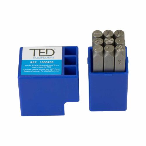 S'utilisant avec la massette TED Equipement, ce lot de 9 caractères spéciaux permet de compléter vos inscriptions sur les étiquettes de marquage, notamment pour les poteaux et chambres souterraines.