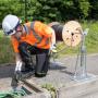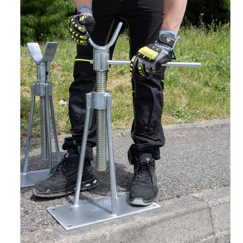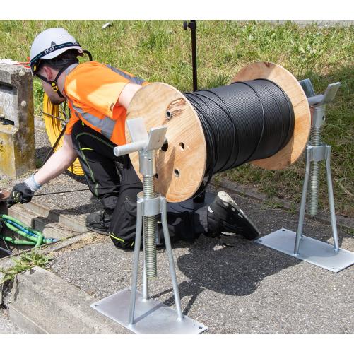 Dispositif de levage mécanique. Adapté pour les sites exigus où une remorque porte-touret ne peut accéder. Les colonnes réglables indépendamment en hauteur permettent l'installation sur des sols présentant des différences de niveaux. Les supports en U peuvent accueillir une barre de déroulage de Ø 55mm maximum.