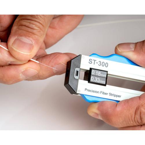 Le dénudeur de fibre optique ST-300 permet de dénuder facilement et proprement lle revêtement d'acrylate de 180 à 330 micros sur les fibres de verre après avoir retiré le revêtement tampon. Ses lames rectifiées et durcies offrent un résultat net. L'outil dispose d'une butée pour dénuder le câble sur une longueur déterminée par l'utilisateur, jusqu'à 5 cm.