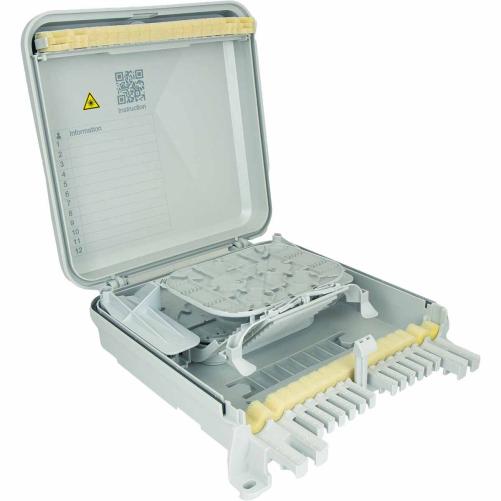Ce Point de Branchement Optique épissure est idéal pour la distribution aérienne de la fibre optique de jusqu'à 12 abonnés. Ce boîtier fibre optique peut être installé sur poteau ou en façade, à l'aide d'un feuillard inox. Le PBO S12 peut accueillir 1 câble de distribution principal et 2 câbles de distribution secondaires ou de dérivation.