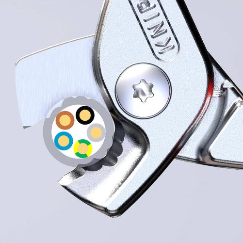 Le coupe-câbles StepCut® par Knipex est un outil de haute qualité conçu pour couper efficacement les câbles en cuivre et en aluminium jusqu'à un diamètre de Ø 15 mm . L'innovation Stepcut dôte ce produit de de cannelures qui  coupent les fils les uns après les autres ; la coupe est jusqu'à 40 % plus facile qu'avec des coupe-câbles standards de la même longueur. Doté de lames trempées par induction, cet outil offre une coupe précise et propre, assurant des connexions électriques fiables et sécurisées.