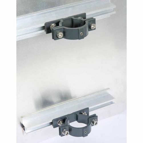 Le panneau est livré avec le kit de fixation (brides, rails et poteau) pour mise en oeuvre sur un poteau, une clôture ou un mur.