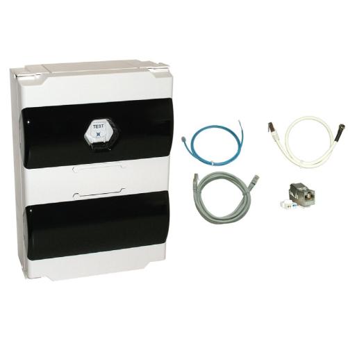 Ce coffret de communication GRADE 3 est conçu pour répondre aux besoins des installations résidentielles en fibre optique. Il intègre un DTI RJ45, un splitter TV à 4 sorties, un support Rail DIN pour 12 ports noyaux «Keystone», ainsi qu’un rail DIN avec emplacement pour DTIO. Le coffret comprend également 4 embases RJ45 catégorie 6A 10G, un bornier de mise à la terre avec cordon, un cordon Balun TV vers RJ45 de 0,5 m, un cordon RJ11 1P dégainé de 1 m (bleu) et 4 cordons RJ45/RJ45 FTP catégorie 6 de 1 m (gris). Il est équipé d’un couvercle blanc avec obturateurs sécables, d’un capot noir fumé avec fenêtre pour DTI et d’un capot noir fumé plein. Fabriqué en ABS blanc (RAL 9003), il mesure 350x250x110 mm pour un poids de 1,3 kg. Idéal pour organiser et sécuriser votre réseau domestique, ce coffret assure une distribution optimale des signaux internet et TV. Fixation par vissage (non fournie).Caractéristiques techniques