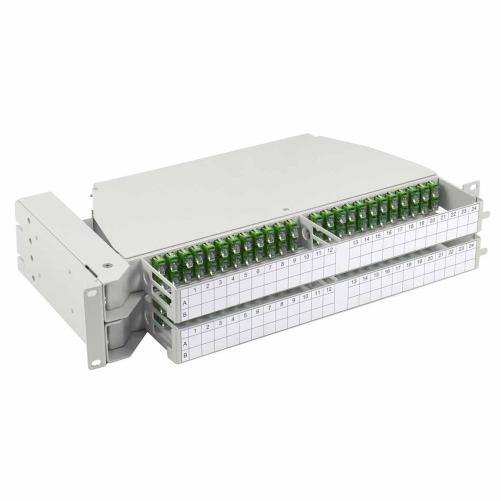 Ce tiroir 19" pivotant modulaire 2U avec raccords SC/APC et fibre optique G.657A2 possède une ouverture gauche complète avec pigtails montés, raccords, gestion des fibres, cassettes et supports d'épissure.